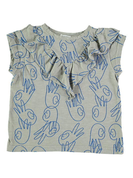 CAMISETA VOLANTES ESTAMPADO MANOS Y CARAS GRIS