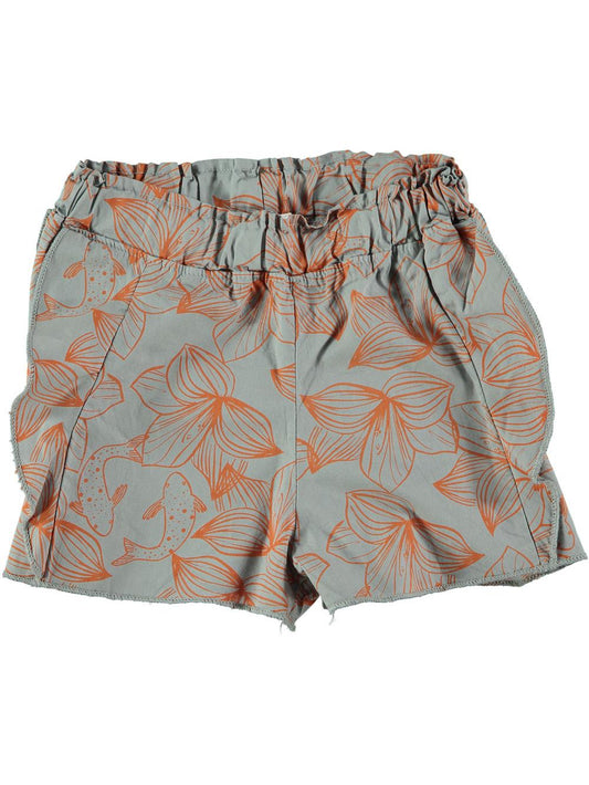 GRAY FISH AND FLOWER PRINT RUFFLED SHORTS