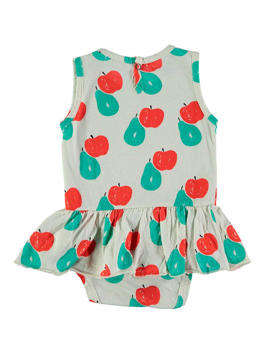 WHITE APPLE AND PEAR PRINT RUFFLED STRAPS BODYSUIT