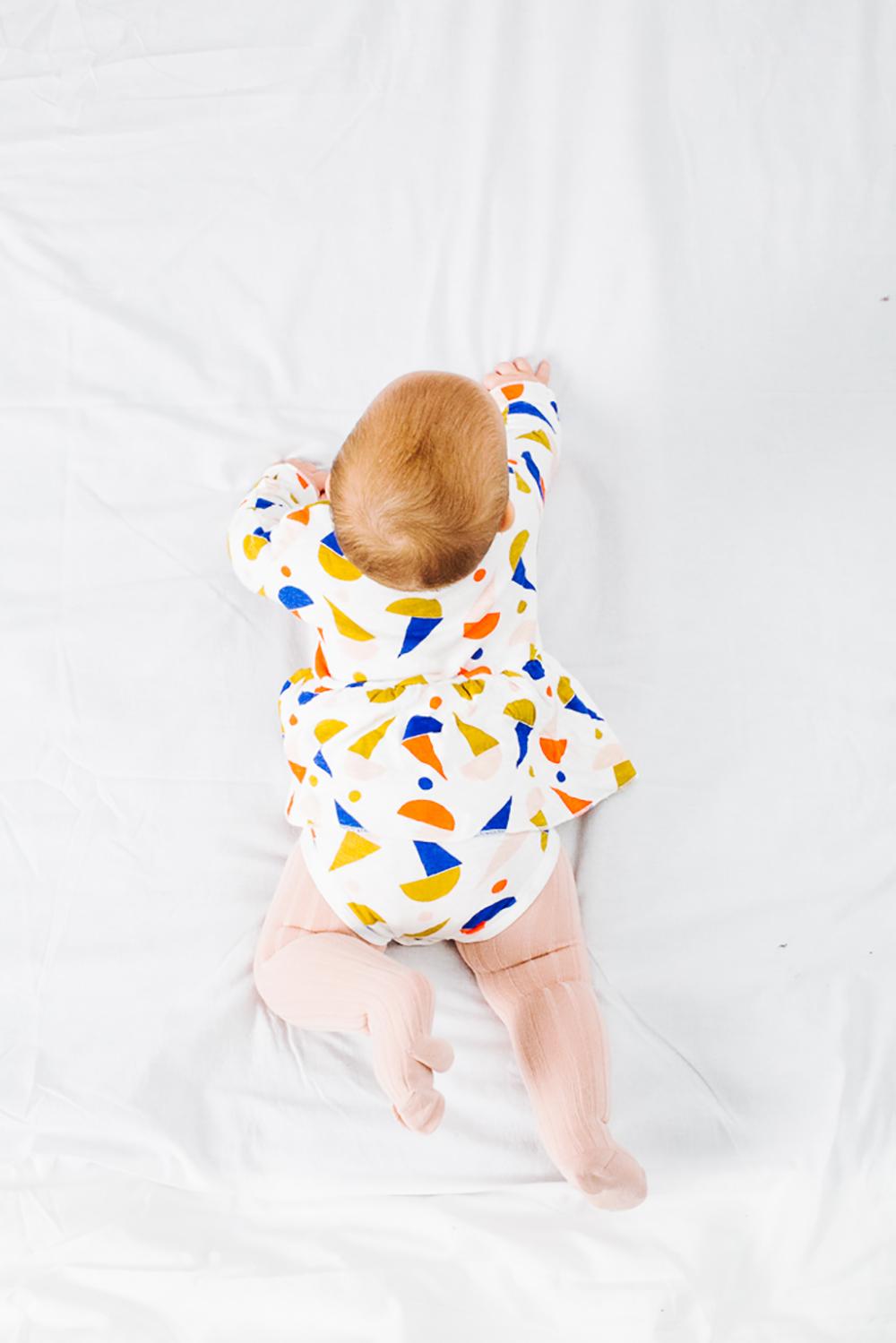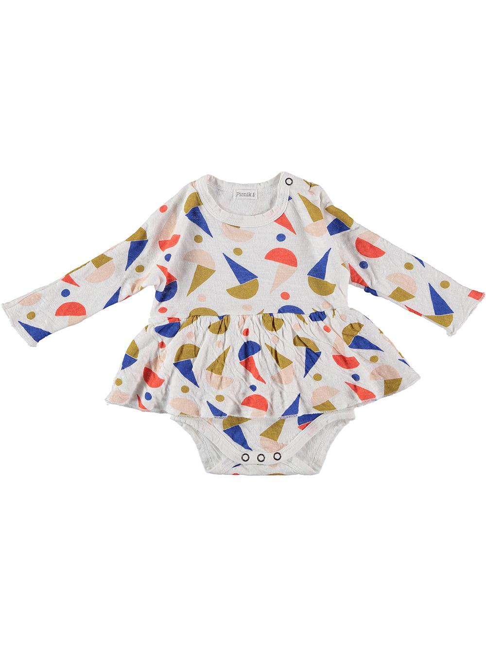 White bodysuit 75% cotton 25% polyester. Long sleeve design. ruffle skirt. with snap closure at the crotch. fitted and round neck. Made in Spain.
