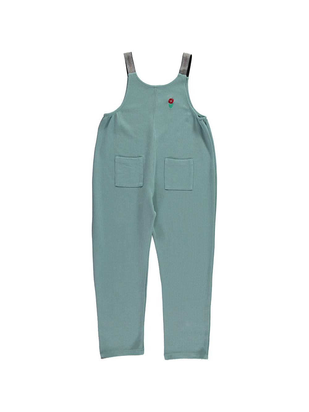 100% cotton blue jumpsuit. Design with fantasy straps. overlapping pockets. embroidery. Made in Spain.
