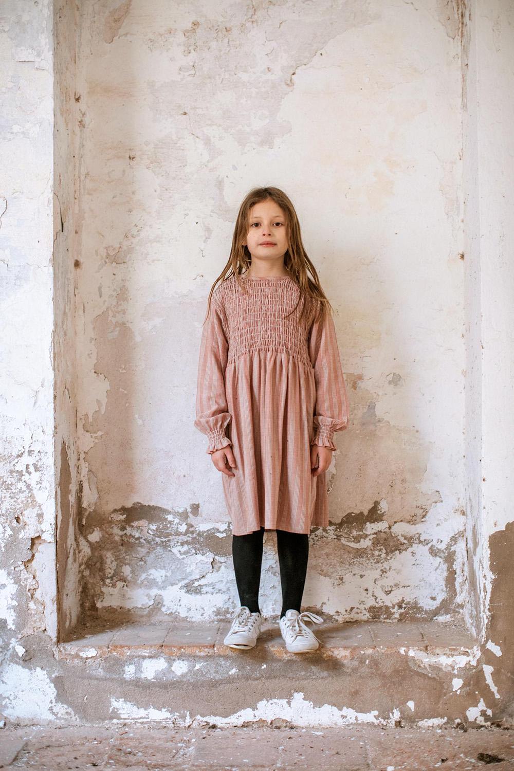 Pink and white striped dress 86% viscose 12% cotton 1% lurex. Long sleeve design. elastic chest and cuffs. embroidery. round neck. Made in Spain.